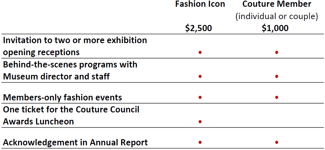 Members of the Couture Council also receive invitations to exclusive events and private viewings, such as visits to designers’ ateliers, and they are invited to all of the museum’s opening receptions. Membership in the Couture Council is tax deductible to the extent allowed by law, and the Couture Council is credited as a sponsor for all exhibitions.